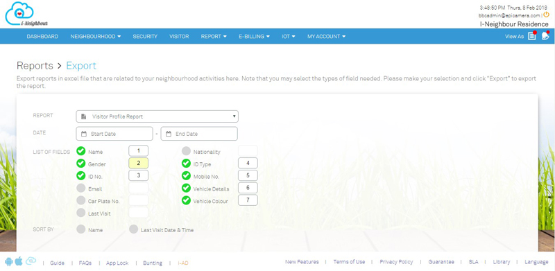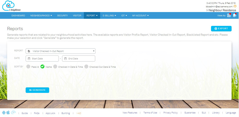 | Administrators can now generate reports that are related to the neighbourhood activities. Specifically, the added reports are Visitor Profile Report, Visitor Checked In-Out Report, Blacklisted Visitor Report, Total Visitor Report and Pre-Registered Visitor Report. Furthermore, Administrators can also choose to export all of the available reports into Excel format by simply clicking on the “Export” button at the top right of the page. Note that the Administrators can also customize the type of fields and even set its arrangement sequence in the report. Sample screenshots are shown as below: 1. Generate Report |