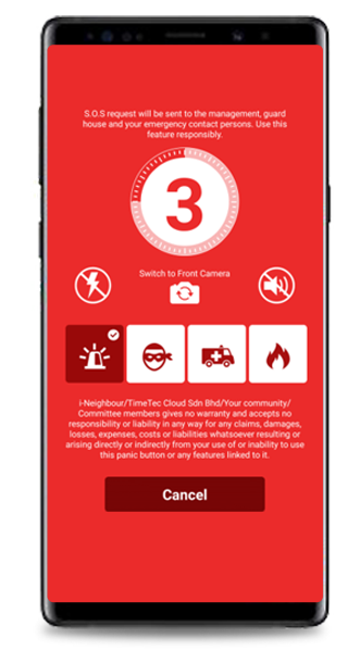 | i-Neighbour’s Panic Button feature will send an S.O.S alert to management, guardhouse, and your emergency contact persons after being triggered. At the same time, the Panic Button will capture 4 photos from the mobile phone and send to the respective recipients. In this latest enhancement, instead of using just the rear camera, we have added an option for users to switch between the rear and front camera. |